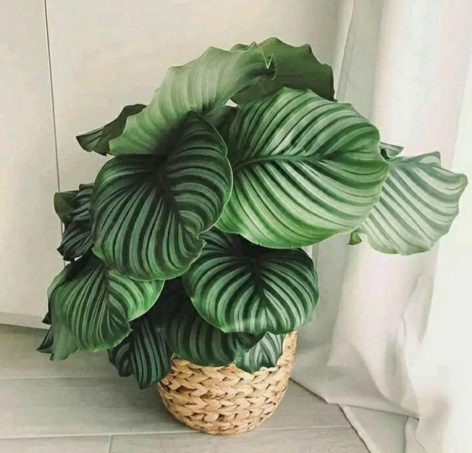 The Calathea orbifolia is a true botanical masterpiece, celebrated for its stunning foliage that makes it a standout in any plant collection. Its large, perfectly rounded leaves are a vibrant green, adorned with mesmerizing, symmetrical stripes of a lighter, silvery-green. Beyond its visual appeal, like other Calatheas, it’s known for its “prayer plant” habit, with leaves gently folding up at night and unfurling in the morning. It thrives in high humidity and medium to bright indirect light, making it ideal for bathrooms or humidified rooms. This plant is a sophisticated choice for those who appreciate intricate natural patterns and air-purifying qualities.